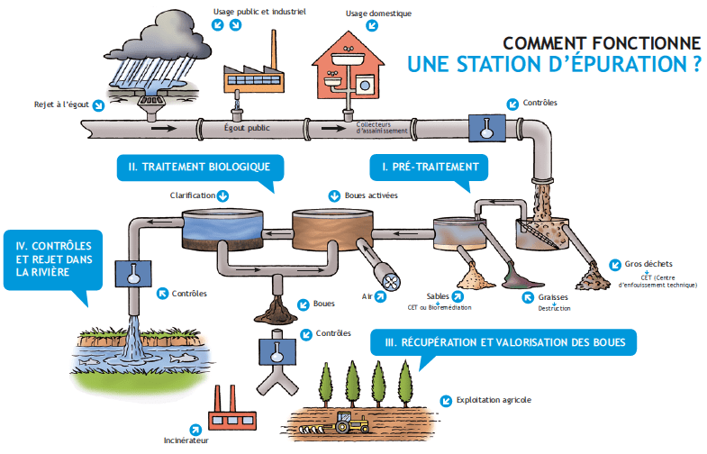 Une station d’épuration a pour but d’assainir les eaux usées urbaines avant leur rejet dans les cours d’eau. Elle n’a PAS pour objectif de rendre les eaux usées potables.