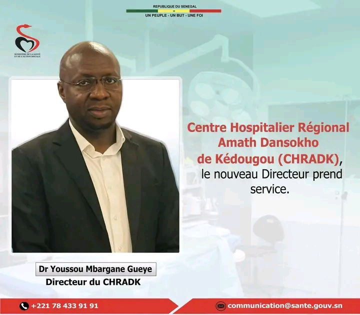 Depuis le 13 mai 2025, le Centre Hospitalier RĂ©gional Amath Dansokho de KĂ©dougou – chradk est placĂ© sous la direction du Dr Youssou Mbargane Gueye, un homme de rigueur, dâengagement et de vision stratĂ©gique.