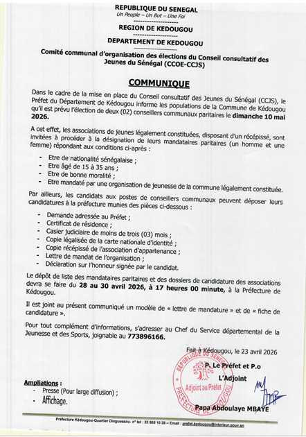 Le Préfet du département de Kédougou a annoncé l’organisation de l’élection de deux conseillers communaux paritaires dans le cadre de la mise en place du Conseil consultatif des Jeunes du Sénégal (CCJS). Le scrutin est prévu le dimanche 10 mai 2026 dans la commune de Kédougou.